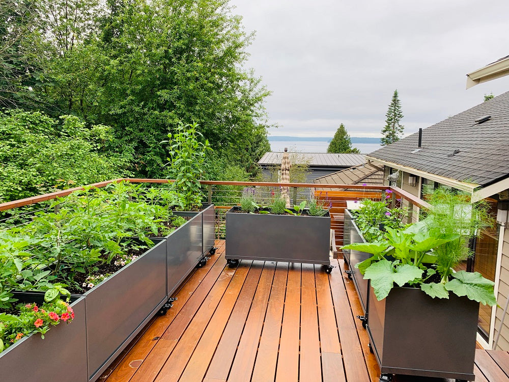 The planter sits in a powder coated steel (wheel) frame. All four casters swivel and have built-in brakes.