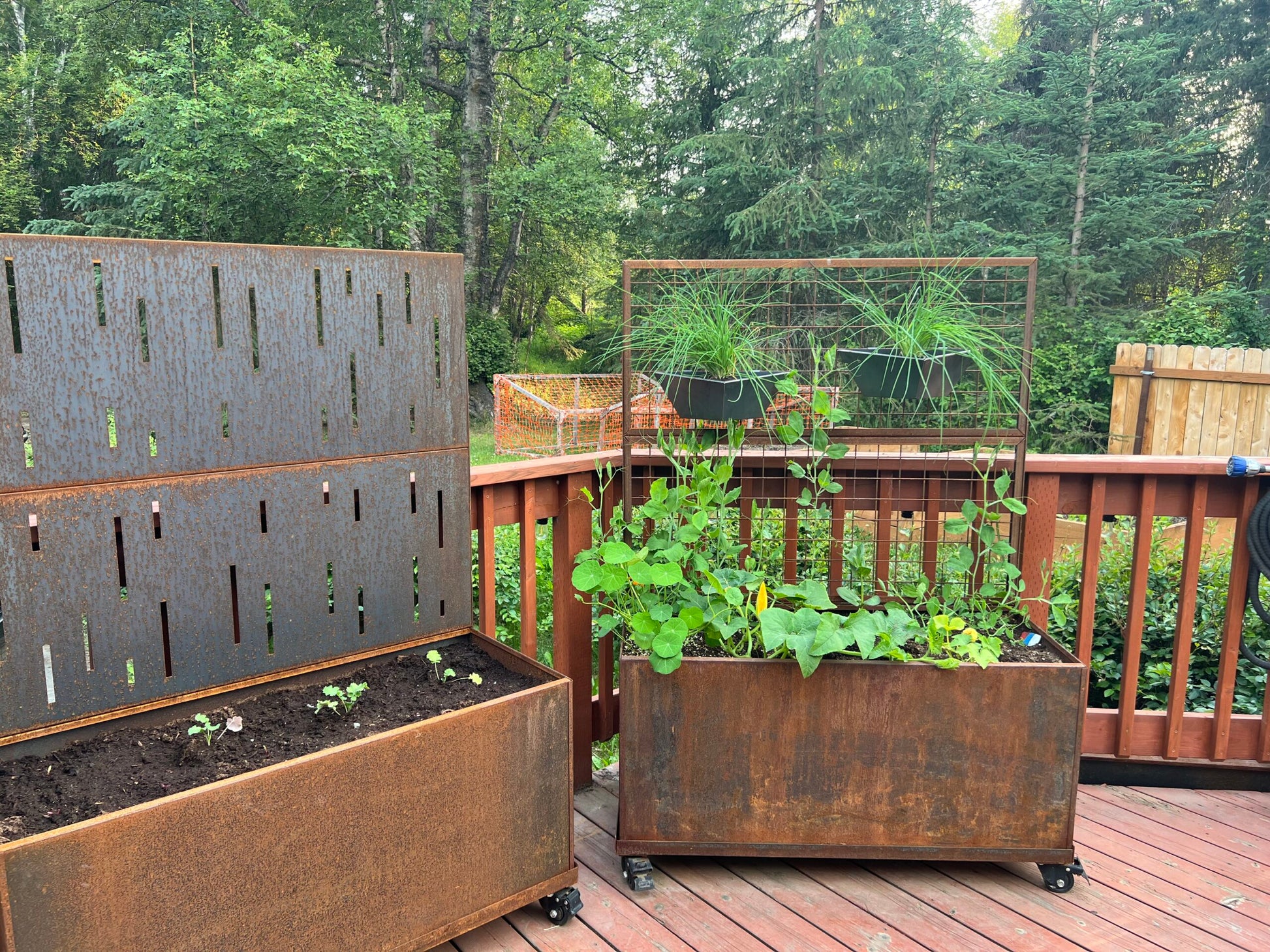 The corten planter fits in a frame which has two laser cut decorative corten steel screens. The corten screens provide privacy and a modern feel.